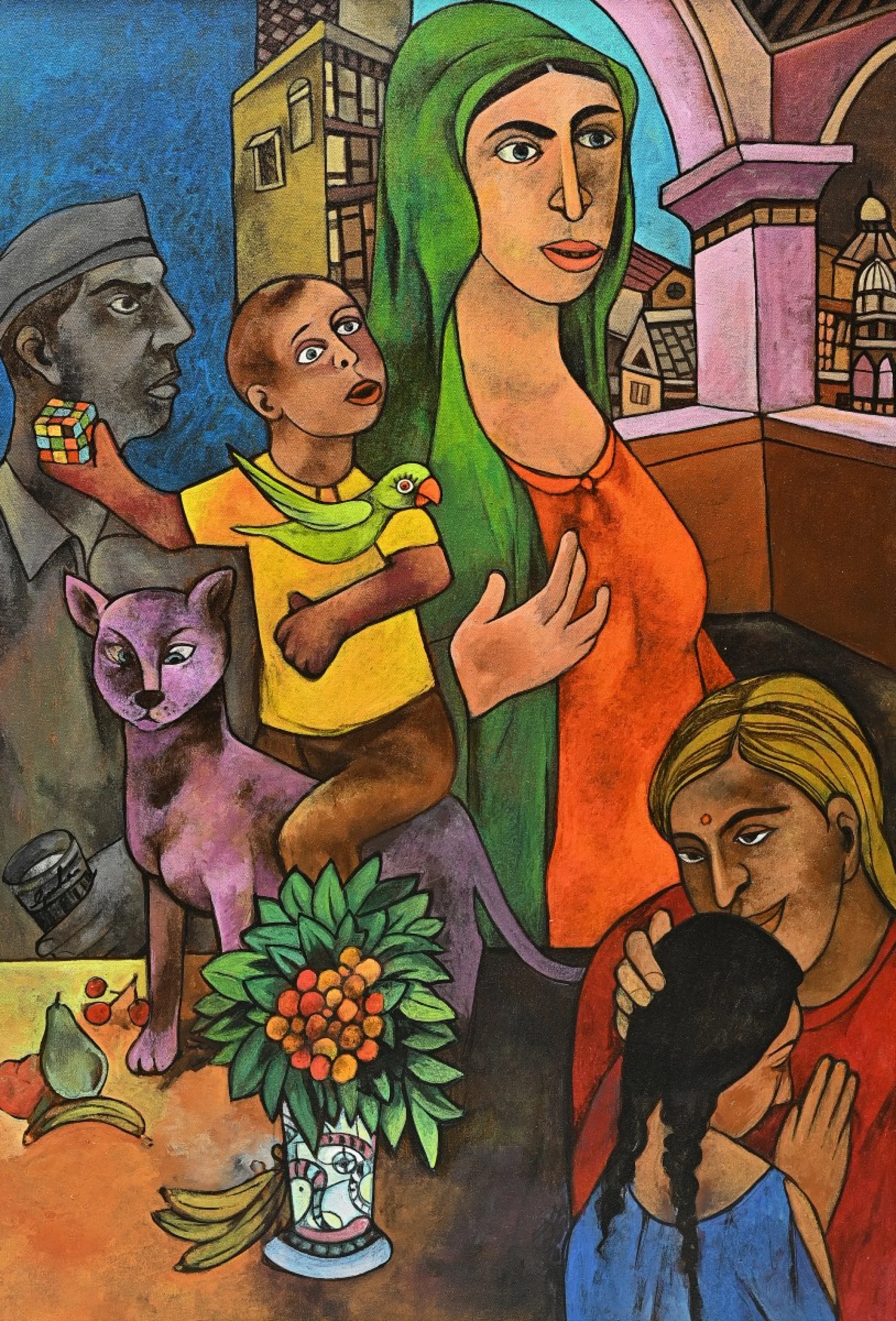 Gurcharan Singh is a distinguished Indian artist known for his deeply humanistic and visually rich portrayals of everyday life in India. A graduate of the Government College of Arts and Craft, Chandigarh (1973), Singh has spent over five decades developing a distinctive figurative style rooted in memory, observation, and a profound empathy for the marginalised. His paintings are populated by street performers, vendors, women, children, animals, and mythic figures, brought together in layered compositions that reflect the simultaneity of the sacred and the secular in Indian life.
