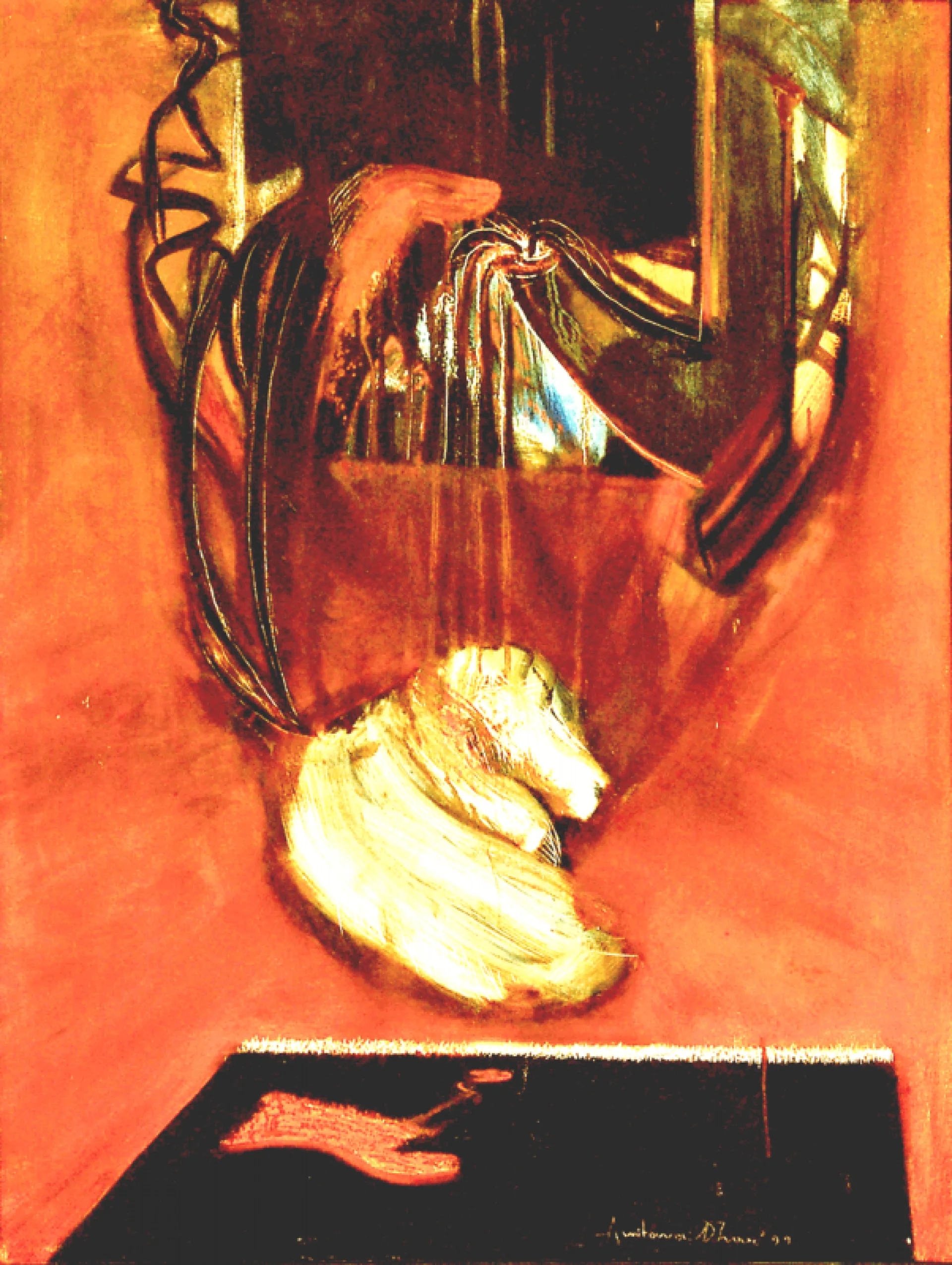 Dhar's thematic explorations go beyond the surface of abstraction, offering commentary on societal issues while maintaining a sense of mystery and depth. His vibrant use of colors, combined with fragmented forms, invites the viewer to interpret the work through personal lenses, often challenging conventional modes of perception. In essence, his works blur the line between abstraction and reality, offering a dynamic visual experience.