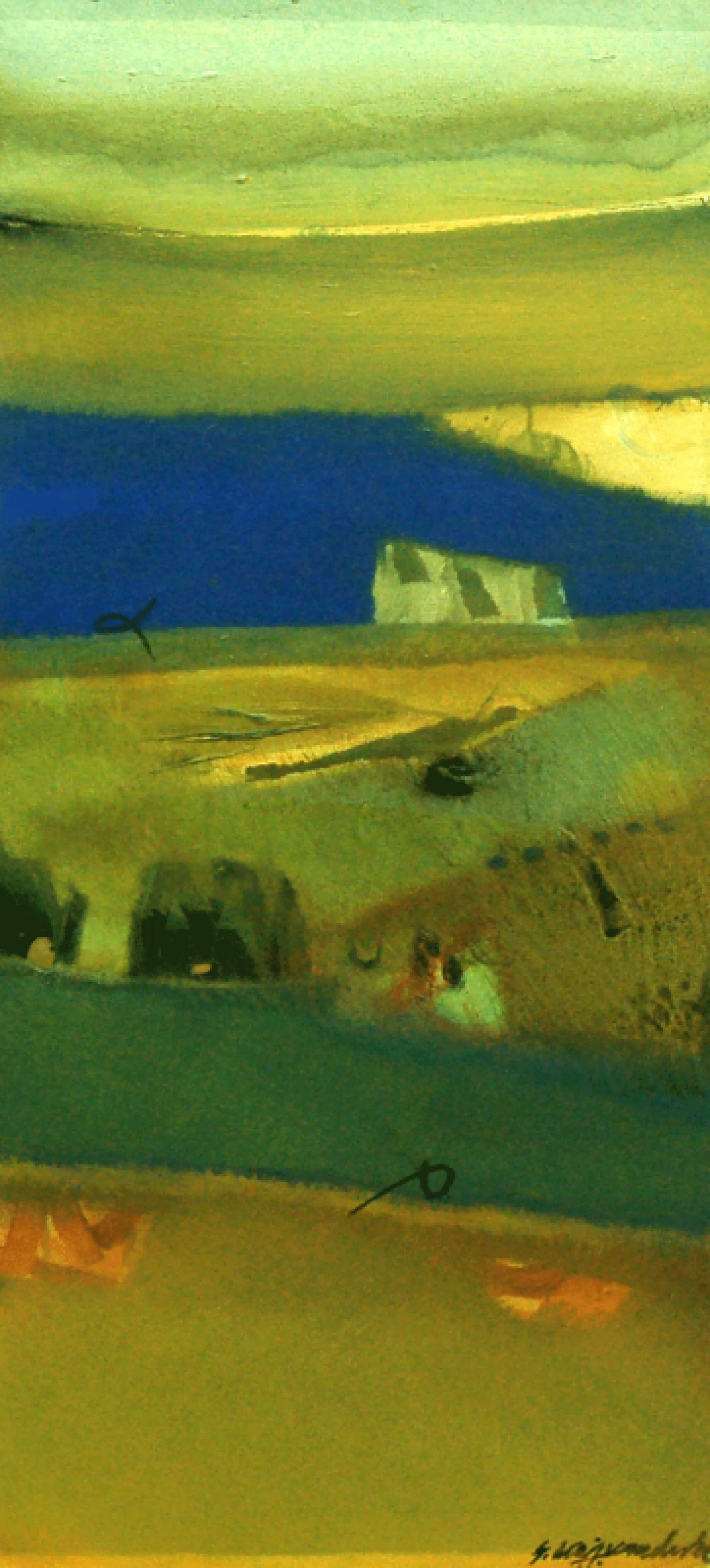 Samindranath Majumdar spent his formative years in suburban Kolkata. Over the years he has witnessed the transformation of the city which he grew up in. His memories of the city had an everlasting impact on him, which surfaced years later in his works. Memory plays an important role in his paintings. He walks the fine line between abstract and representational works.