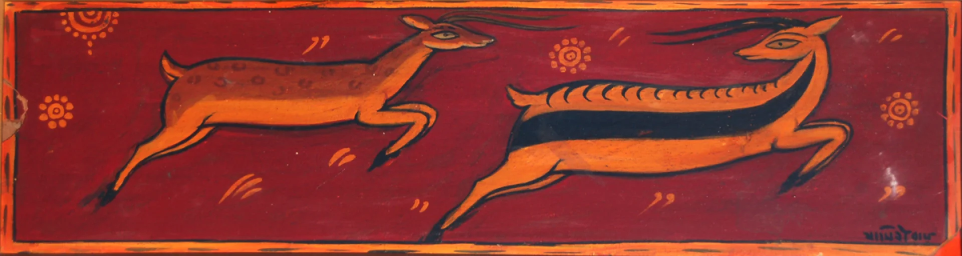 Roy’s paintings are characterised by bold, simplified forms, strong contour lines, and flat planes of colour, often rendered using natural pigments on materials such as cloth, wood, and handmade paper. His subjects frequently include Krishna legends, Ramayana narratives, Santhal dancers, mother-and-child motifs, and rural life—imbued with a sense of rhythmic harmony and spiritual quietude.