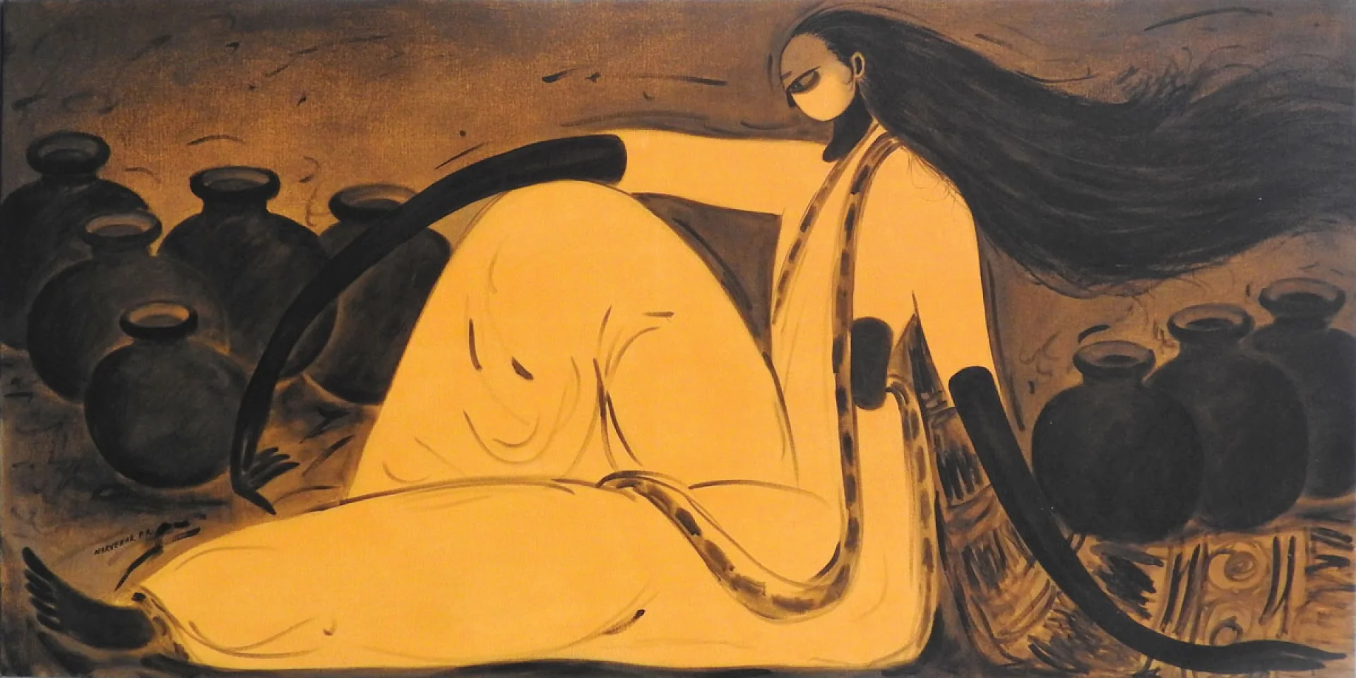 One of Narvekar's most distinctive artistic signatures lies in his use of ochre and black as the primary colors in his monochromatic works. The juxtaposition of these hues symbolizes the duality of existence - the darkness and the light, the hardship and the hope, the despair and the resilience. The figures in his compositions, bathed in the contrasting tones of black and ochre, become embodiments of the human spirit, navigating the tumultuous waters of life with grace and fortitude.