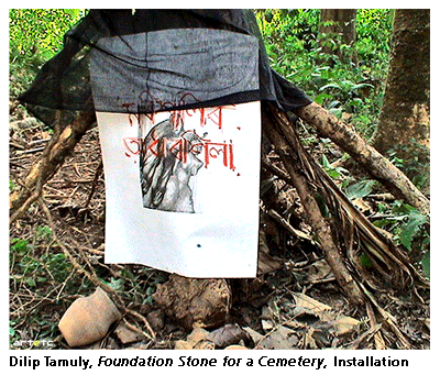 The protest art which are commemorative of the Black Friday in Assam were however not a collective expression like the Neo-Gene artists of Manipur but sporadic individual phenomenon done within the span of a month or a year in protest against that horrific event. The installation called Against Holocaust and Terrorism by Rajkumar was installed in the Dighalipukhuri paar, the bank of the 500 year old pond in the heart of Guwahati city, where the artist erected three huge door frames all burned in fire. In front of those doors in the open space few children were asked to draw something with chalk on the floor with their own imagination. It was installed simultaneously to a rally summoned by the civil society of Guwahati where people gathered to protest against the brutal killing of hundreds of people in the blast. Another artist namely Dadul Chaliha enacted another installation in the same place to commemorate the hoary incident and protest against the ruthless violence on the same day after one year. The installation was enacted with earthen lamp and paper flowers to put across the message of resistance against violence by using materials which were bio degradable. Another installation enacted along with these two was done by Dilip Tamuly within few days of the blast in the cemetery of Vasistha ashram area in Guwahati, a holy place known as Vasistha Muni's Ashram in local belief. Rendered poignantly with an earthen pot signifying the ritualistic urn used for the rites in funerals, several multicoloured threads and a stone found in the nearby forest area of the cemetery area, this work Foundation Stone of a Cemetery became the metaphorical representation of Black Friday. Tamuly also directed a performance in keeping to the subject of the installation, executed by his students of the Govt. College of art and craft where he is a faculty member. It is worth mentioning herein that