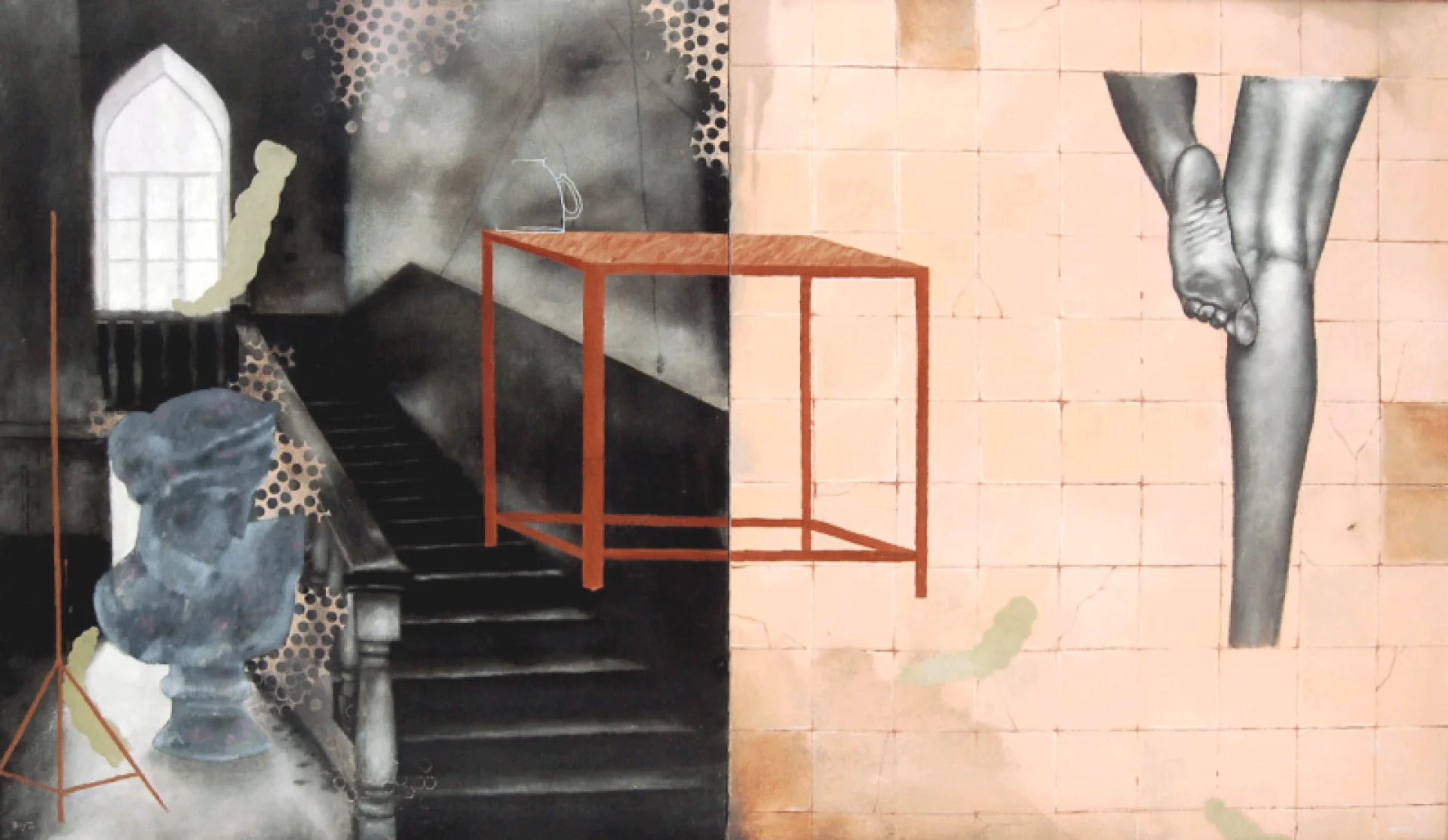 reality. Employing subtle visual cues, texts, and conceptual frameworks, his canvases