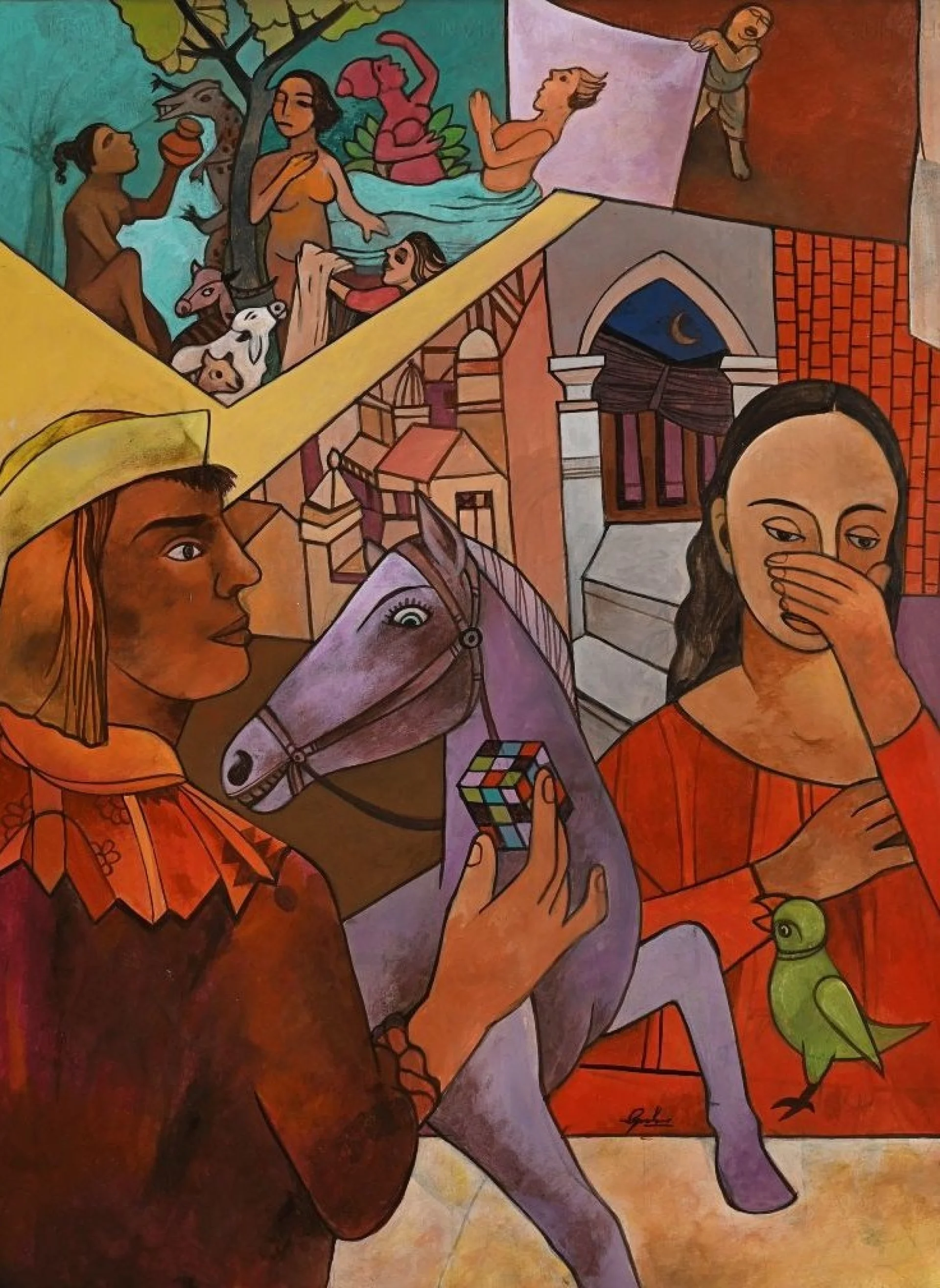 Singh’s practice blends elements of Indian miniature painting, folk traditions, and modernist aesthetics, marked by strong contours, flattened perspective, and a vibrant palette. His works collapse time and space, weaving together fragments of personal memory and social history into tableaux that feel both intimate and collective. While his visual language is grounded in Indian urban and rural landscapes, it speaks to universal themes of displacement, labour, ritual, and belonging.