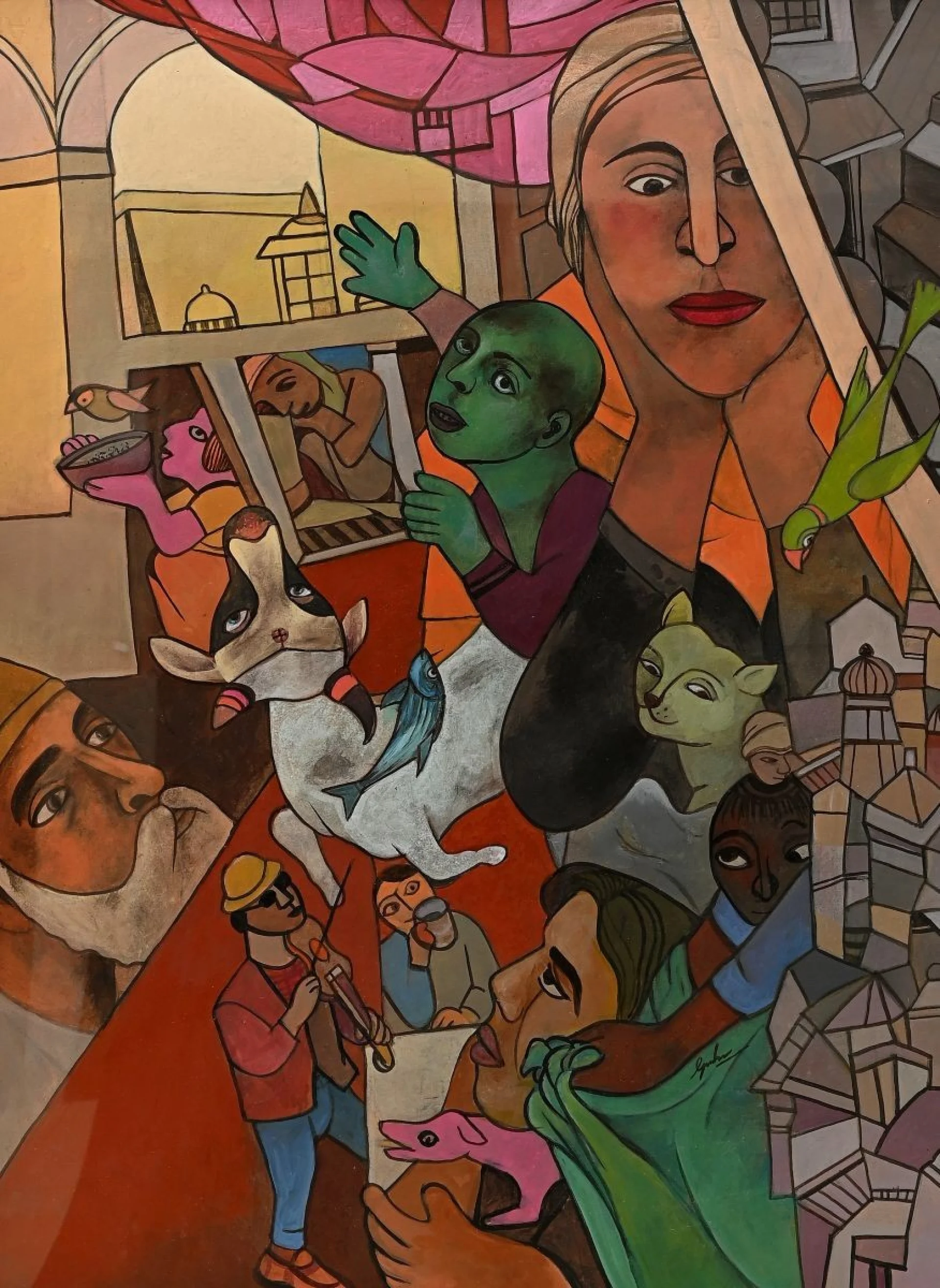 Gurcharan Singh is a distinguished Indian artist known for his deeply humanistic and visually rich portrayals of everyday life in India. A graduate of the Government College of Arts and Craft, Chandigarh (1973), Singh has spent over five decades developing a distinctive figurative style rooted in memory, observation, and a profound empathy for the marginalised. His paintings are populated by street performers, vendors, women, children, animals, and mythic figures, brought together in layered compositions that reflect the simultaneity of the sacred and the secular in Indian life.
