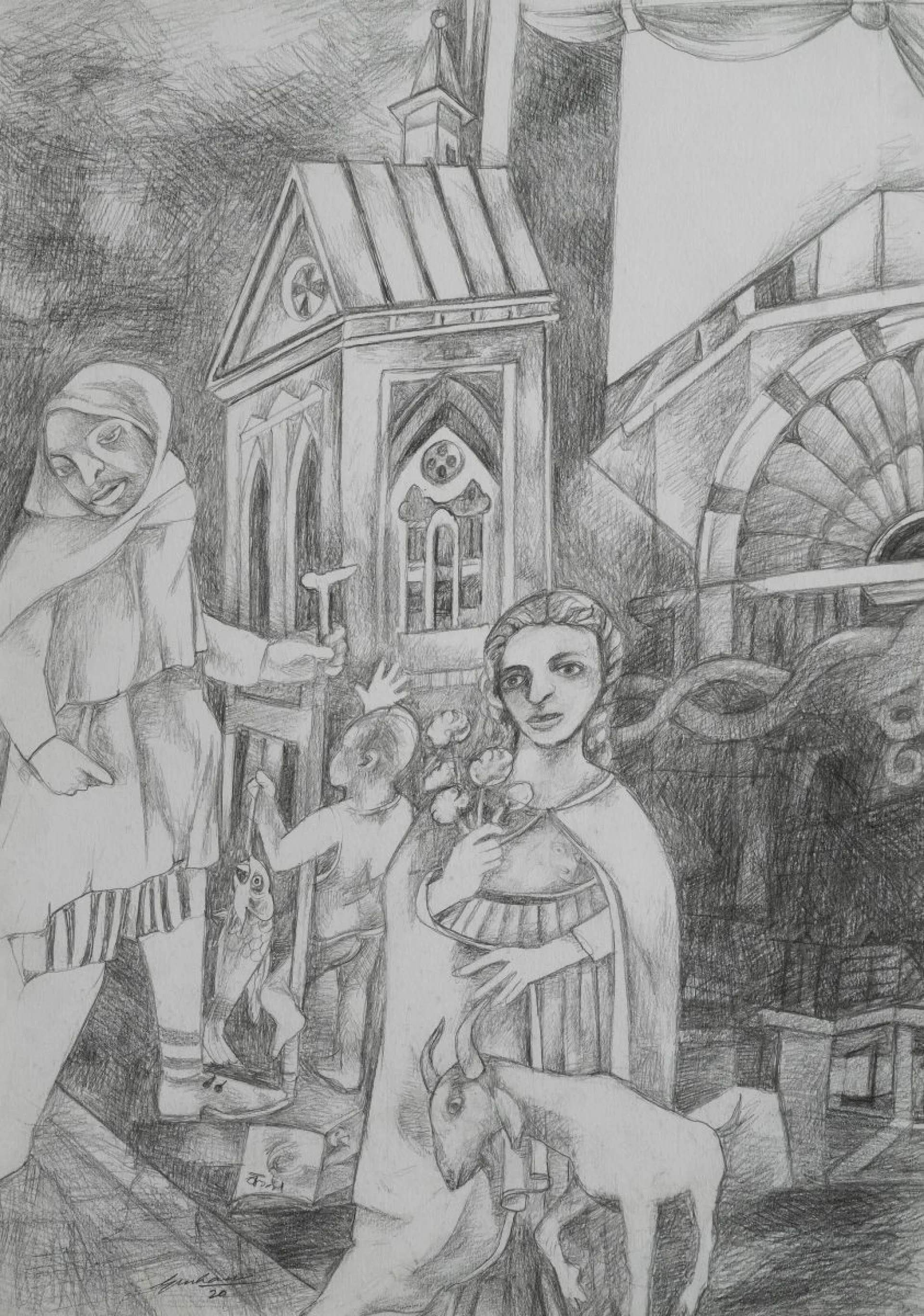 Singh’s practice blends elements of Indian miniature painting, folk traditions, and modernist aesthetics, marked by strong contours, flattened perspective, and a vibrant palette. His works collapse time and space, weaving together fragments of personal memory and social history into tableaux that feel both intimate and collective. While his visual language is grounded in Indian urban and rural landscapes, it speaks to universal themes of displacement, labour, ritual, and belonging.