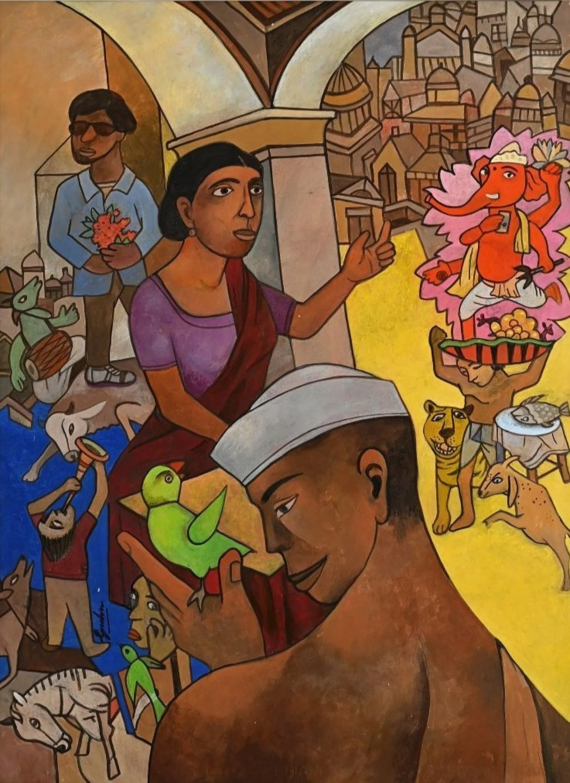 Gurcharan Singh is a distinguished Indian artist known for his deeply humanistic and visually rich portrayals of everyday life in India. A graduate of the Government College of Arts and Craft, Chandigarh (1973), Singh has spent over five decades developing a distinctive figurative style rooted in memory, observation, and a profound empathy for the marginalised. His paintings are populated by street performers, vendors, women, children, animals, and mythic figures, brought together in layered compositions that reflect the simultaneity of the sacred and the secular in Indian life.