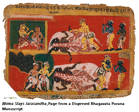 The style and metaphorical presentation of this "lyrical" painting tradition has its roots in illustrated manuscripts made for Jain and Hindu patrons. These paintings are often visual depiction of poetic verse and attempts to give form to moods engendered by music, and interpretations of the great religious epics. In the fifteenth century, Jain patrons from Gujarat commissioned illustrated texts recounting the miracles of Mahavira. In the early sixteenth century, Rajput texts illustrating Hindu epics such as the Bhagavata Purana expanded upon the visual strategies of the Jain manuscripts by beginning a colorful palette. Both the Jain and the Hindu paintings generously juxtapose events occurring at different times and places and employ an iconography of gesture to articulate the narrative.