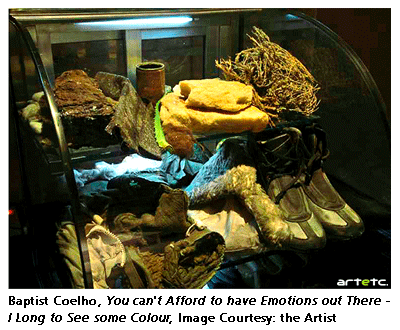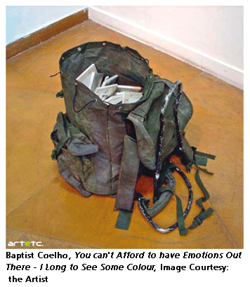 Baptist Coelho, a Bombay based artist, explored the matter. He interviewed soldiers, he collected used items left over by soldiers, he recorded videos and he took photographs. He explored the soldiers' environment from different point of views, psychological, emotional, clinical, memories. He tried to visit the soldiers on the glacier but was not granted permission. The authorities' refusal did not stop him to put together the body of works dedicated to the Siachen war. Baptist started You Can't Have Emotions Out There … in 2009 and keeps adding to it. He reminds us, the viewers. He does not want us to forget. He writes a 3-D book encapsulating stories nobody really cares about. He captures elements of personal history that will one day become History.