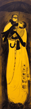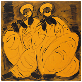 Narvekar's long struggle to build up a form containing his own identity, exemplify how assimilation of tradition with universal values can find an aesthetic resurrection and uplift the local to the level of global. At a certain level of his career he could realize that apart from creating narratives and describing the here and now reality, a major function of the artist lies in creating an essential form that quintessentially grows from the inner consciousness and subconscious of the artist. The uniqueness of such 'form' along with unveiling of the inner being of the artist enlightens a community-oriented identity that acts as a bridge between national and international ideals of beauty, transforms the local into global. All his paintings in this show are figurative and human based. He distorts or transforms the figure rhythmically, rather extracts rhythm from the essence of civilization and induces it within the human figures so that these resonate with an inner harmony.